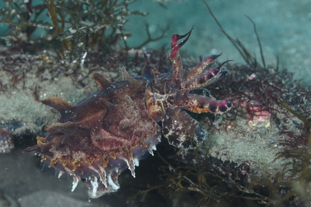 さらに深場、例のシロいアマはいずれの巣穴も不在でしたが、別荘にはキントキが復活していました。