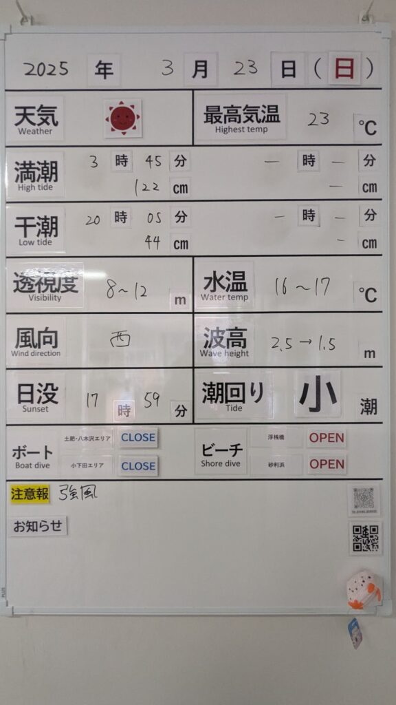 2025年3月23日 / 最終更新日 : 2025年3月23日 toids2021 海況情報 ビーチのみ【OPEN】、ボートは【CLOSE】です。 ビーチは終日問題なく潜れます! 沖はうねりが大きく、これからさらに風も強くなる予報ですのでCLOSEといたします。 FacebookXCopy