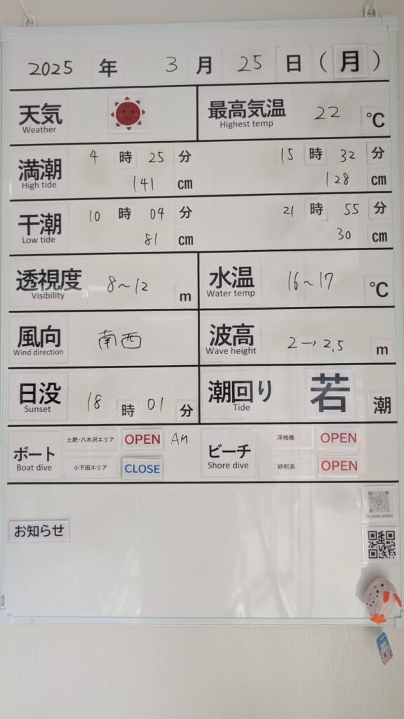 2025年3月25日 / 最終更新日 : 2025年3月25日 toids2021 海況情報 ビーチ&ボートともに【OPEN】です。 朝イチは風もなく海も穏やかで、ボートも八木沢エリアのみOPENです。 だんだんと南西風が強くなる予報ですので、ボートは午前中のみとなるでしょう。 鉄壁のビーチは終日問題なく潜れます! FacebookXCopy