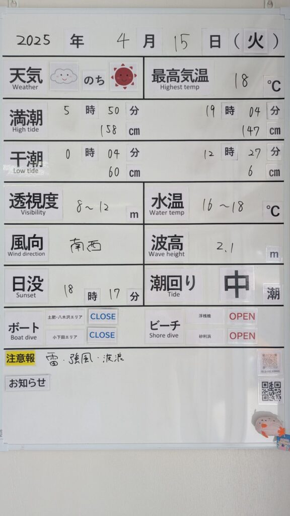 2025年4月15日 / 最終更新日 : 2025年4月15日 toids2021 海況情報 ビーチのみ【OPEN】、ボートは【CLOSE】です。 鉄壁の通り崎ビーチは問題なく潜れます! 浅場が若干揺れているのでEn/Ex時にはご注意ください。 沖はうねりが大きいためボートはCLOSEです。 FacebookXCopy