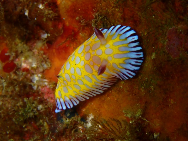 箱型ブロックにくっ付くやたら派手で目立つウミウシ、ボブサンウミウシ発見です。