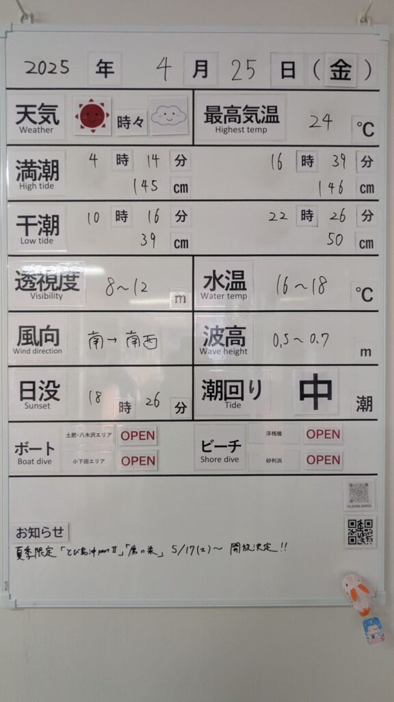 2025年4月25日 / 最終更新日 : 2025年4月25日 toids2021 海況情報 ビーチ&ボートともに【OPEN】です。 非常に穏やかな海況です。 午後からは南西風が強くなってきそうですので、 ボートは早めが良いでしょう。 FacebookXCopy