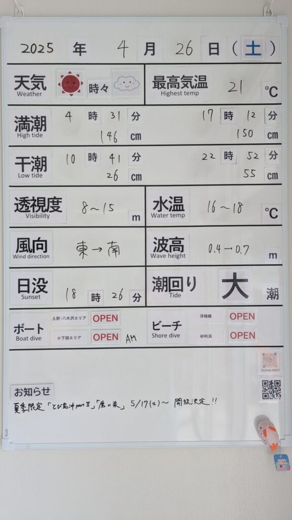 2025年4月26日 / 最終更新日 : 2025年4月26日 toids2021 海況情報 ビーチ&ボートともに【OPEN】です。 朝イチは風もなく非常に穏やかな海況! ベタ凪でボートも快適に出船できます。 午後は南風が強くなるので、小下田エリアへはお早めに。 ビーチ含む八木沢エリアは終日問題なく潜れます。 FacebookXCopy