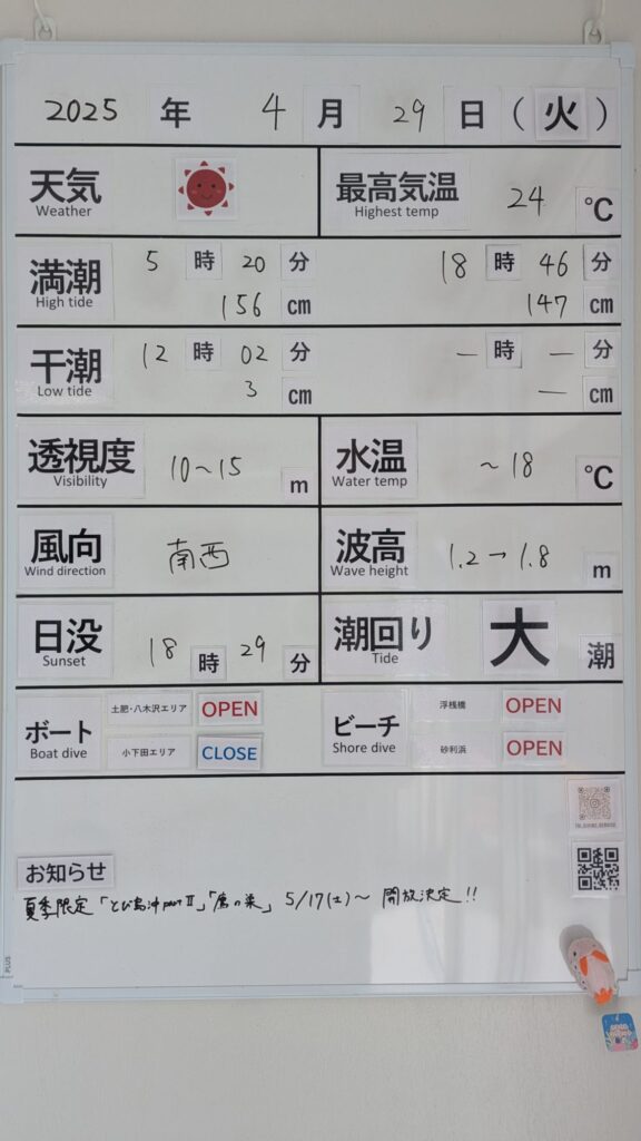 2025年4月29日 / 最終更新日 : 2025年4月29日 toids2021 海況情報 ビーチ&ボートともに【OPEN】です。 ビーチは非常に穏やか! 沖はうねりがあるため、ボートは八木沢エリアのみのOPENです。 南西風が強くなるため午前中のみとなりそうです。 ビーチにも揺れが入ってきそうですのでお早めに。 FacebookXCopy