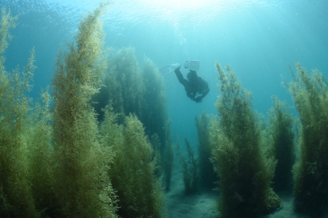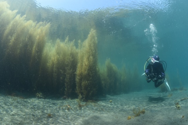 ホンダワラの森が水底から水面まで高く立ち上がる場所はダイバーを入れるとスケール感が伝わりますね。