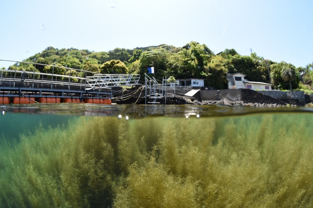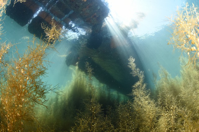 隙間から差し込む太陽光線と、まるで桟橋を水底に引きずり込もうとするかのように伸びたホンダワラが美しい。