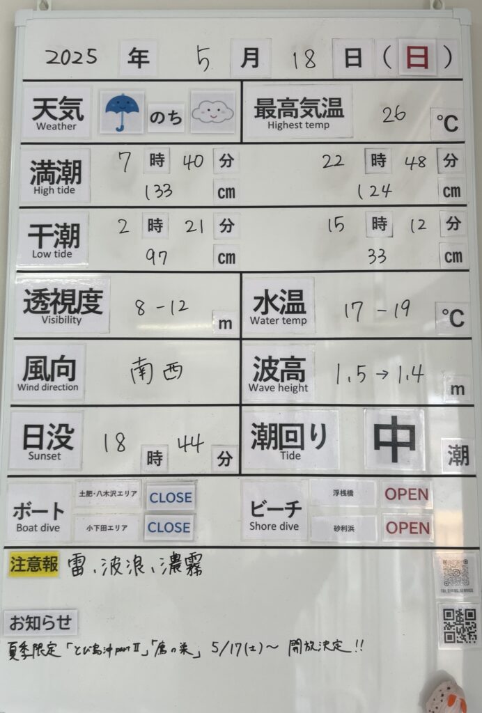 2025年5月18日 / 最終更新日 : 2025年5月18日 toids2021 海況情報 ビーチのみ【OPEN】、ボートは【CLOSE】です。 鉄壁のビーチは終日問題なく潜れます。 ボートは南西風が強く吹く為オールCLOSEといたします。 FacebookXCopy