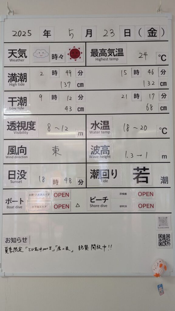 2025年5月23日 / 最終更新日 : 2025年5月23日 toids2021 海況情報 ビーチ&ボートともに【OPEN】です。 東風で非常に穏やかな海況です。 ボートも問題なく出船可能ですが、 小下田エリアにはまだ若干うねりが残りますので、もう少し落ち着いてからがオススメです。 FacebookXCopy