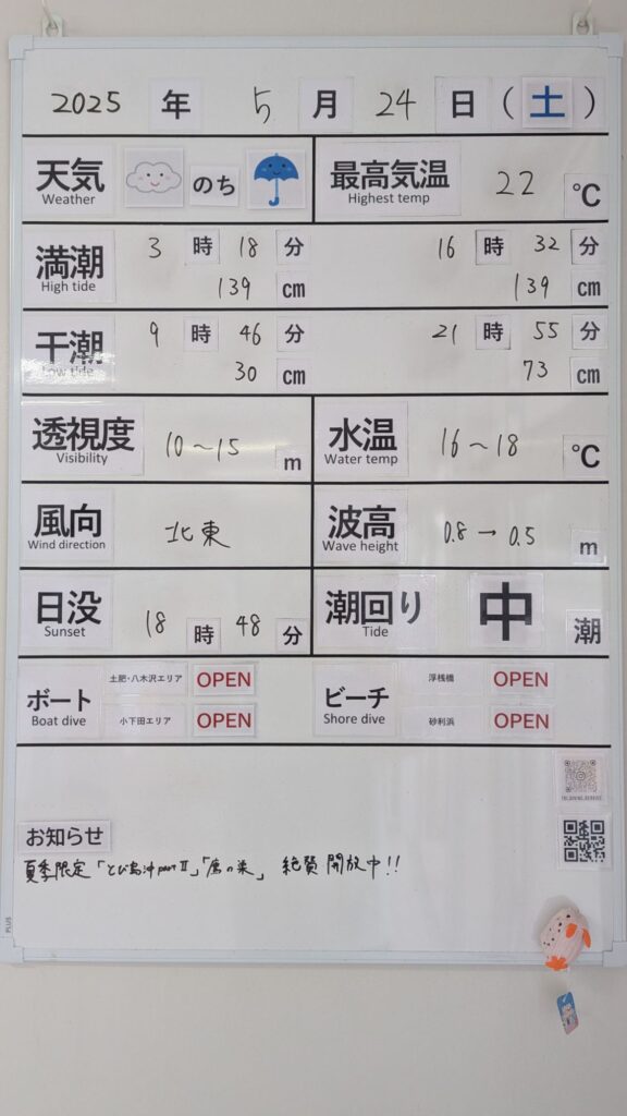 2025年5月24日 / 最終更新日 : 2025年5月24日 toids2021 海況情報 ビーチ&ボートともに【OPEN】です。 東風で非常に穏やかな海況です。 ボートも快適に出船できます! 良い透明度が続いています! FacebookXCopy
