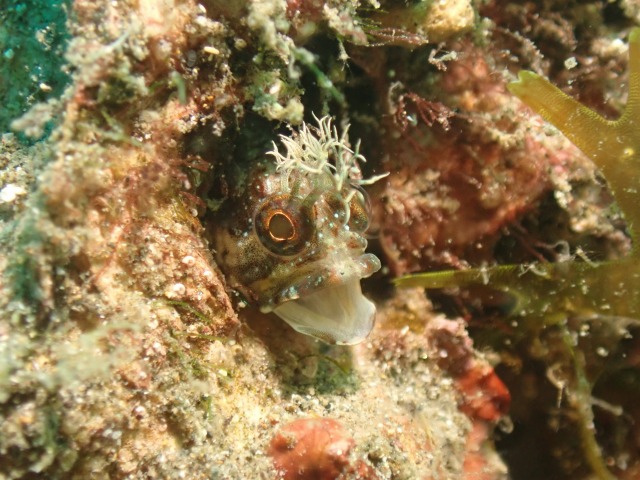水深14m付近のフジツボの殻の中にはコケギンポが隠れていました。