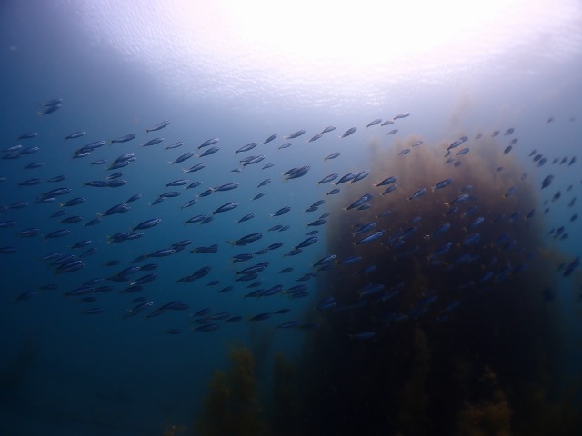 アオリイカが産卵している岩付近でムツの稚魚の群れが通り過ぎていきました。