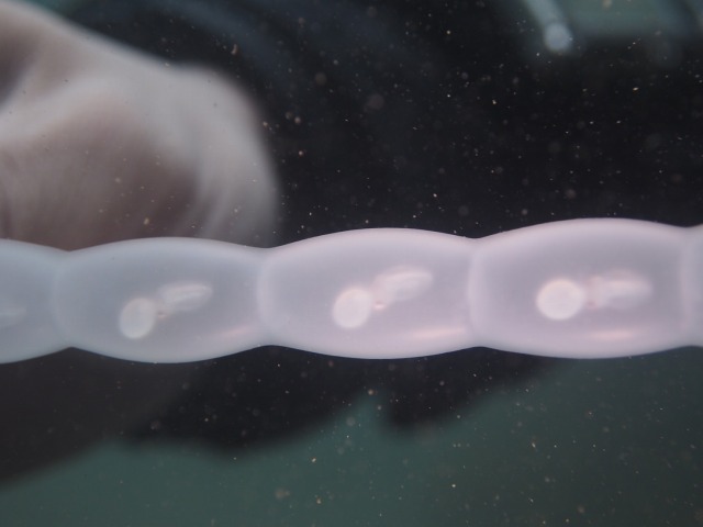 反対から照らして透かすと、卵の中にもう既にちっこいイカの形をした中身が見えます。