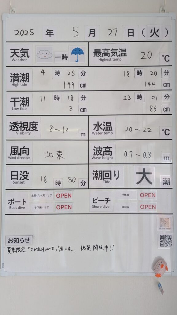 2025年5月27日 / 最終更新日 : 2025年5月27日 toids2021 海況情報 ビーチ&ボートともに【OPEN】です。 東風で非常に穏やかな海況です。 道中は風を受けますが、小下田エリアへも比較的穏やかになり問題なく潜れます。 ビーチも快適コンディションです! ※本日浮桟橋修理のため、ビーチのEn/Exはフラッグ下の単管ラダーからのみといたします。 FacebookXCopy