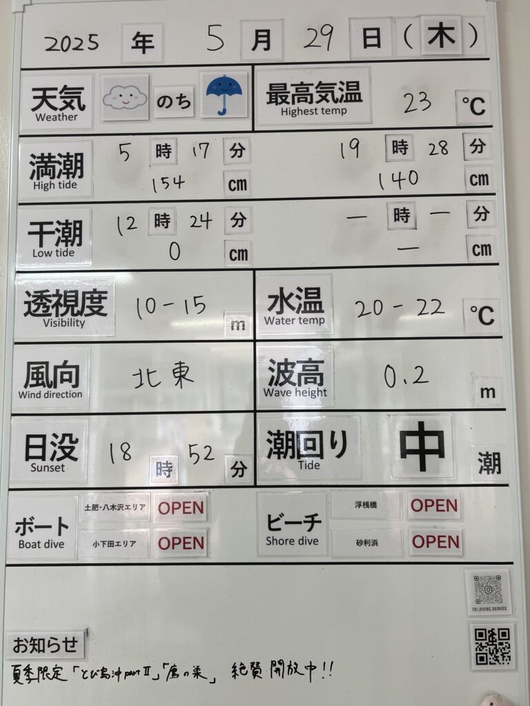 2025年5月29日 / 最終更新日 : 2025年5月29日 toids2021 海況情報 ビーチ&ボートともに【OPEN】です。 風も無く非常に穏やかです! ボートも小下田エリアまで問題無く出航できます。 FacebookXCopy
