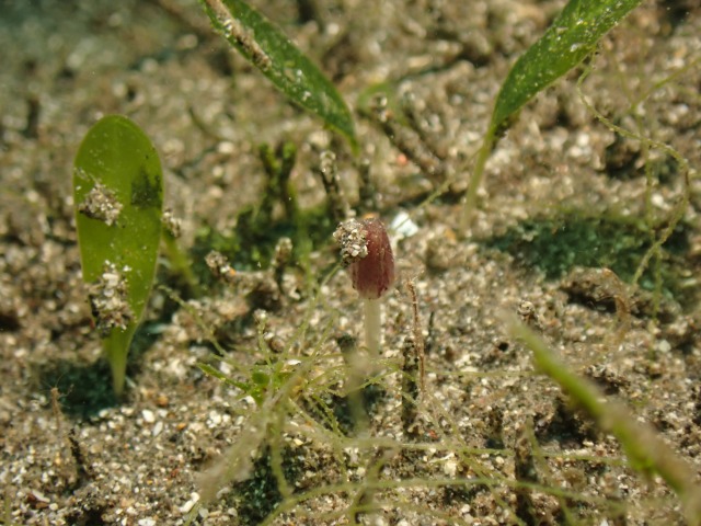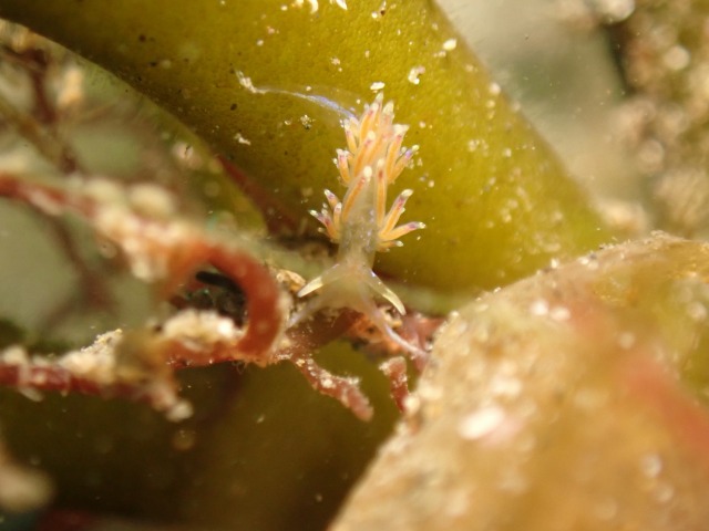 東の境界ロープ沿いに生えたミルに小さなセトミノウミウシを発見です。