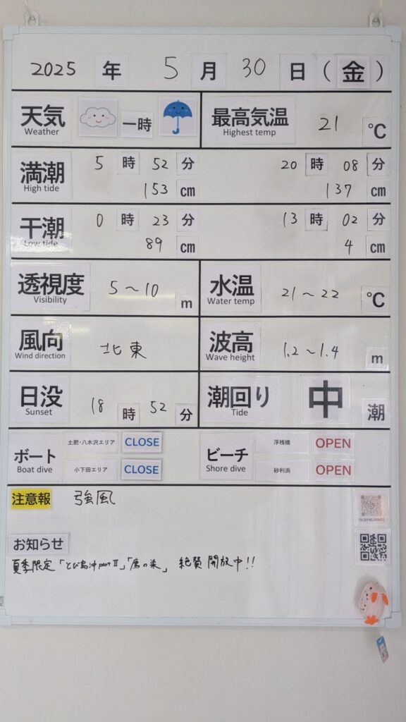 2025年5月30日 / 最終更新日 : 2025年5月30日 toids2021 海況情報 ビーチのみ【OPEN】、ボートは【CLOSE】です。 風が強く出船困難なためボートはオールCLOSEです。 北東風が強く、ビーチの中にも吹き込んでくることで水面がザワついています。 水面付近は若干揺れがありますが、そこを抜けてしまえば問題なく潜れます。 En/Ex時は特にご注意ください。 FacebookXCopy