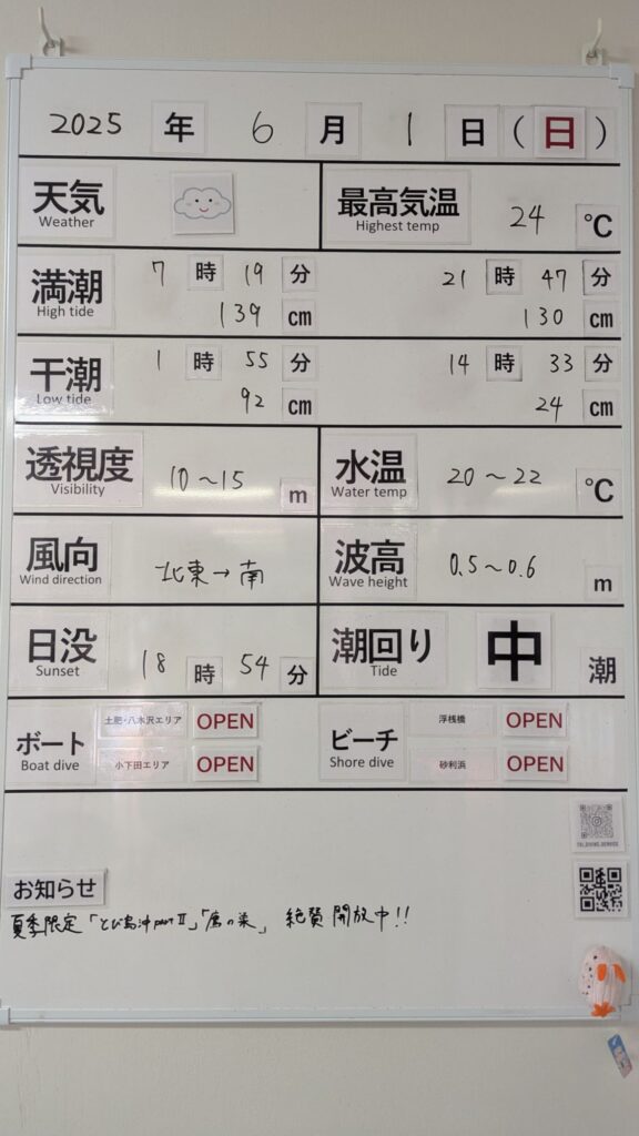 2025年6月1日 / 最終更新日 : 2025年6月1日 toids2021 海況情報 ビーチ&ボートともに【OPEN】です。 風もなく非常に穏やかな海況です。 小下田エリアへも快適に出船できます。 FacebookXCopy