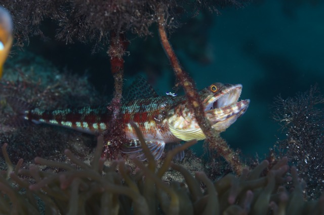 ブイ下からひとつ北側のブロック群の上、口をあんぐり空けたエソ。