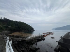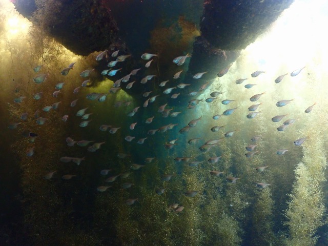浮桟橋の真下、ホンダワラが伸びて火を遮り、薄暗いトンネルになっています。