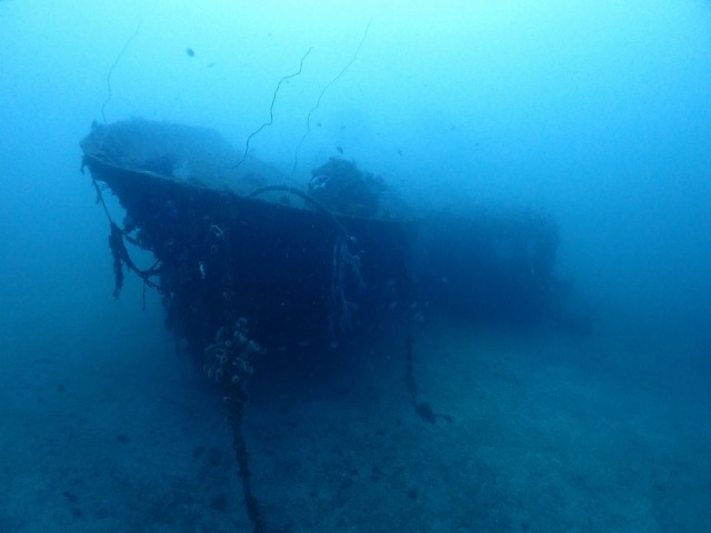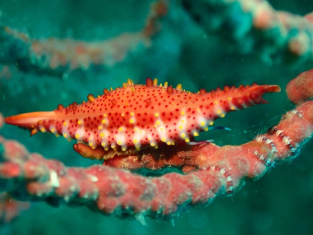 大きい沈船を探索しているとウミトサカにギヤマンカクレエビが隠れていました。