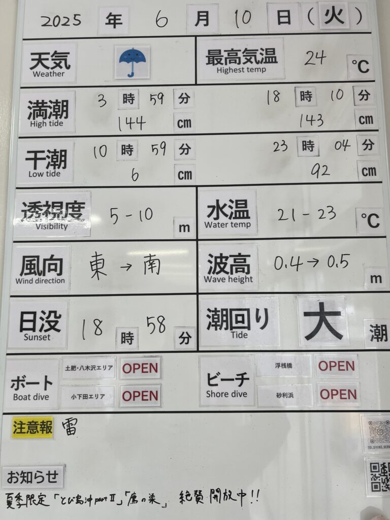 2025年6月10日 / 最終更新日 : 2025年6月10日 toids2021 海況情報 ビーチ&ボートともに【OPEN】です。 風もなく非常に穏やか! 小下田エリアへも快適に出船できます。 終日雨予報となりますので水中は暗くなりそうです。 水中ライトなどを忘れずに! FacebookXCopy