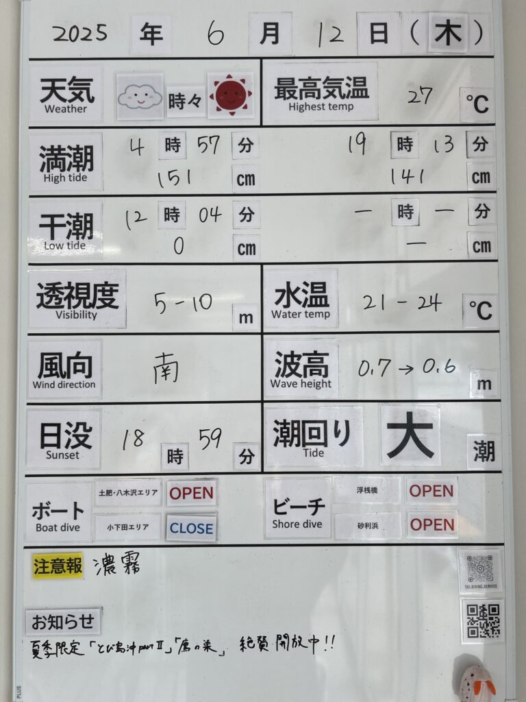 2025年6月12日 / 最終更新日 : 2025年6月12日 toids2021 海況情報 ビーチ&ボートともに【OPEN】です。 風も弱まり穏やか! ビーチ&ボートともにOPENです。 ボートは小下田エリアにうねりが大きく残るため、八木沢エリアのみといたします。 FacebookXCopy