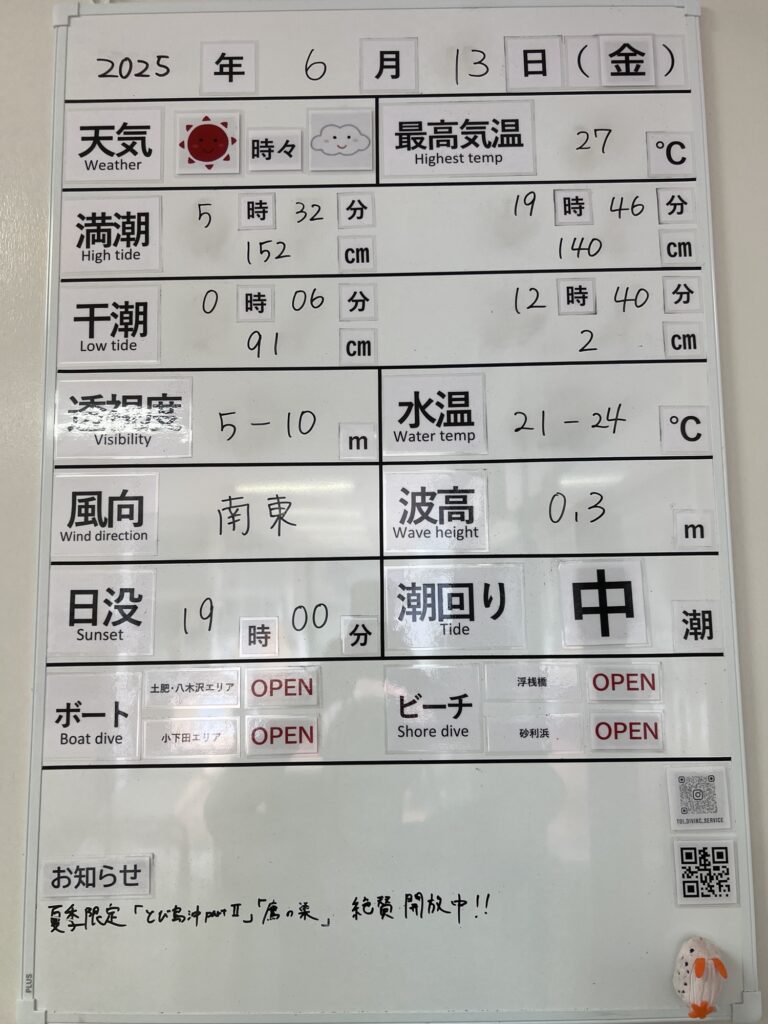 2025年6月13日 / 最終更新日 : 2025年6月13日 toids2021 海況情報 ビーチ&ボートともに【OPEN】です。 天気も良く非常に穏やかな海況です。 ボートも小下田エリアまで問題なく出船できます。 FacebookXCopy