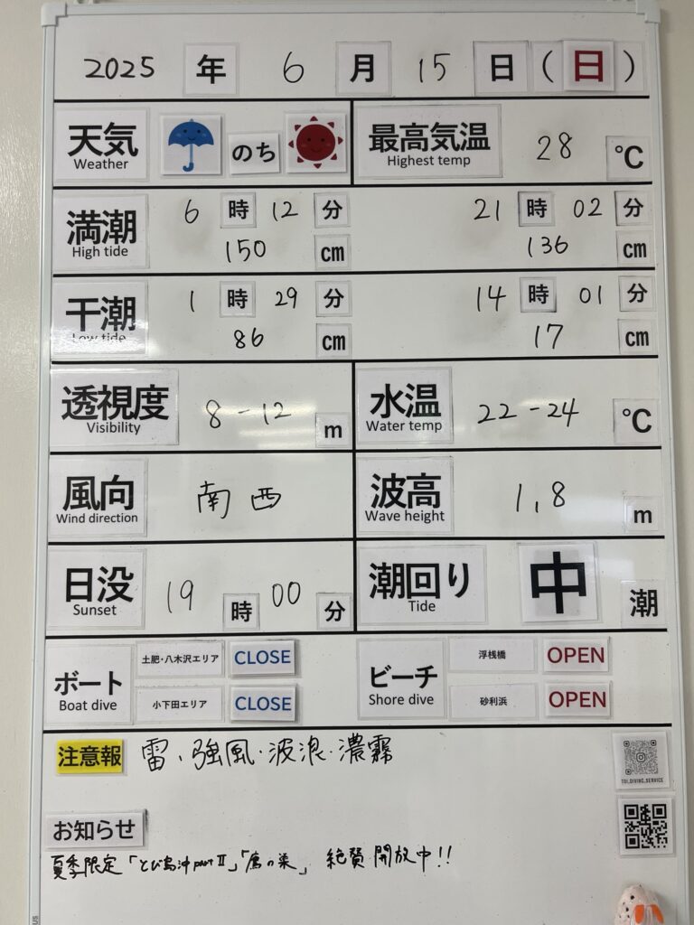 2025年6月15日 / 最終更新日 : 2025年6月15日 toids2021 海況情報 ビーチのみ【OPEN】、ボートは【CLOSE】です。 南西風が強く、沖は大荒れです。 鉄壁のビーチは問題なく潜れますが、浅場は風の影響で若干揺れが入るでしょう。 FacebookXCopy