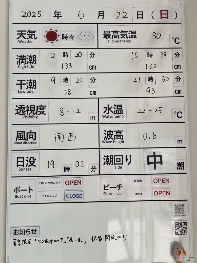 2025年6月22日 / 最終更新日 : 2025年6月22日 toids2021 海況情報 ビーチ&ボートともに【OPEN】です。 南西風ですが穏やかな海況です。 ボートは小下田エリアのうねりが大きいためCLOSEです。 次第に風が強くなってきますので八木沢エリアも早めの出船がいいでしょう。 FacebookXCopy