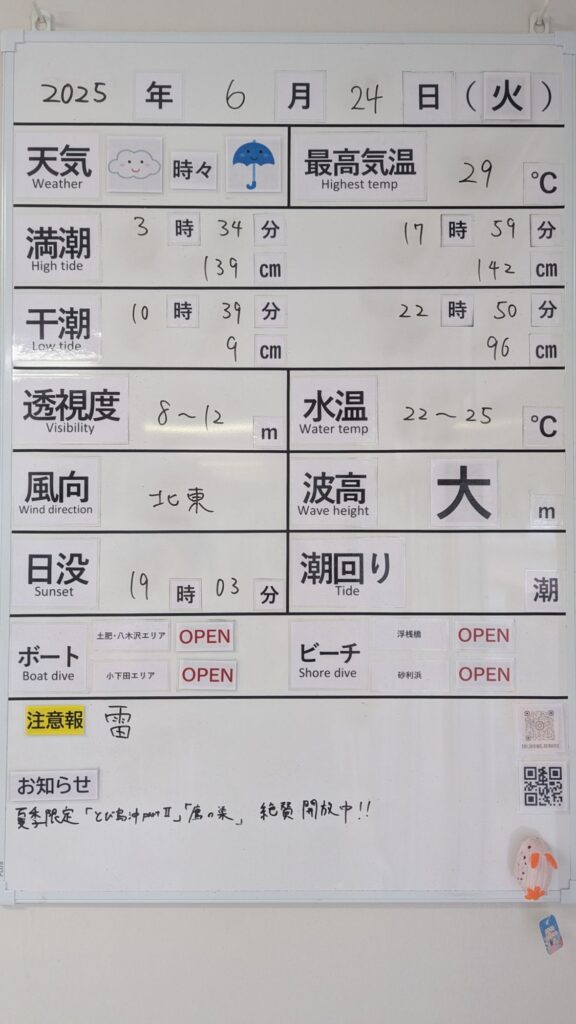 2025年6月24日 / 最終更新日 : 2025年6月24日 toids2021 海況情報 ビーチ&ボートともに【OPEN】です。 風もなくベタ凪です! 終日非常に穏やかな海況でしょう。 小下田エリアへも快適に出航できます。 FacebookXCopy