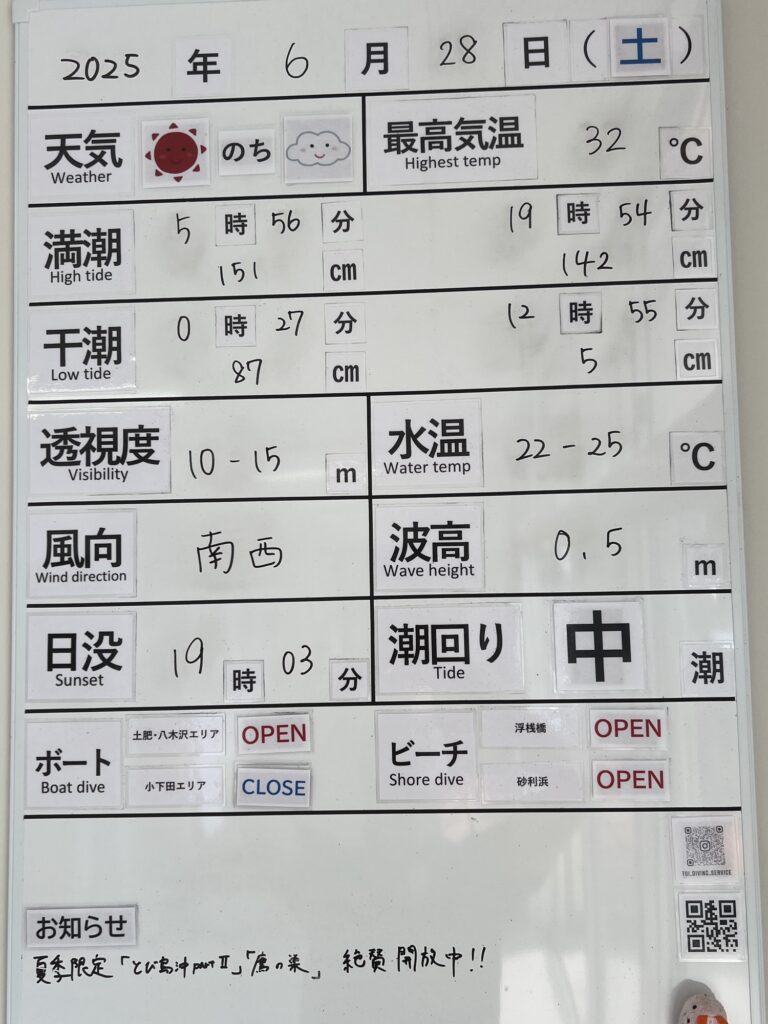 2025年6月28日 / 最終更新日 : 2025年6月28日 toids2021 海況情報 ビーチ&ボートともに【OPEN】です。 風も弱まり非常に快適なコンディション! 小下田エリアにも問題なく出船できます。 暑くなりますので熱中症、日焼け対策を忘れずに! FacebookXCopy