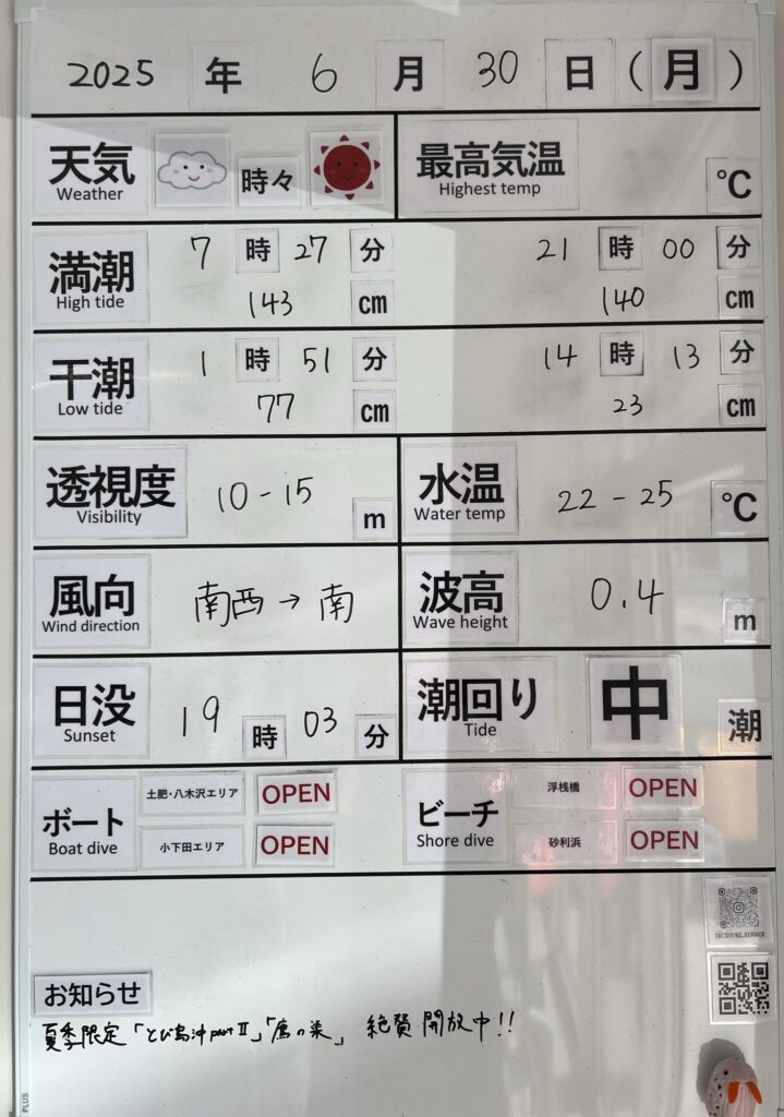 2025年6月30日 / 最終更新日 : 2025年6月30日 toids2021 海況情報 ビーチ&ボートともに【OPEN】です。 非常に穏やかな海況です! ボートは小下田エリアへも快適に出船できます。 次第に風が強くなってくる予報ですので早めの出船がいいでしょう! FacebookXCopy