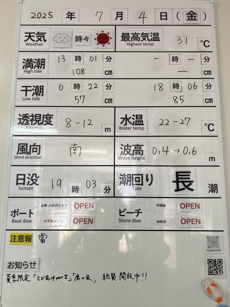 2025年7月4日 / 最終更新日 : 2025年7月4日 toids2021 海況情報 ビーチ&ボートともに【OPEN】です。 非常に穏やかな海況でビーチ&ボートともにOPENです。 小下田エリアも快適に出船できます。 次第に南風が強くなって来ますので早めが良いでしょう。 FacebookXCopy