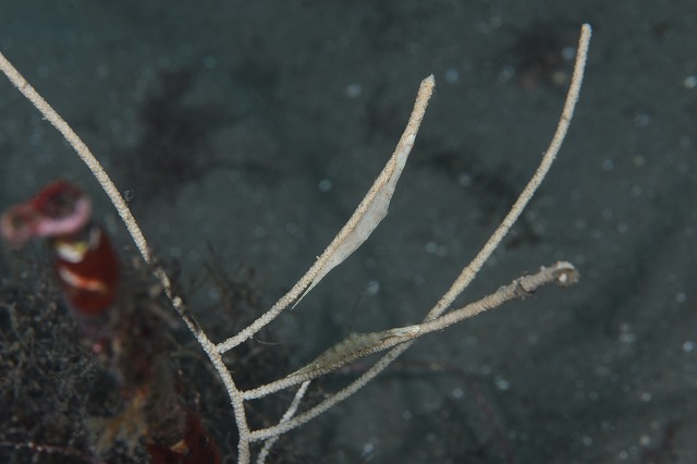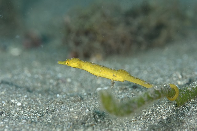 千切れたミル片に掴まり続けるキレイな黄色いタツノイトコ。