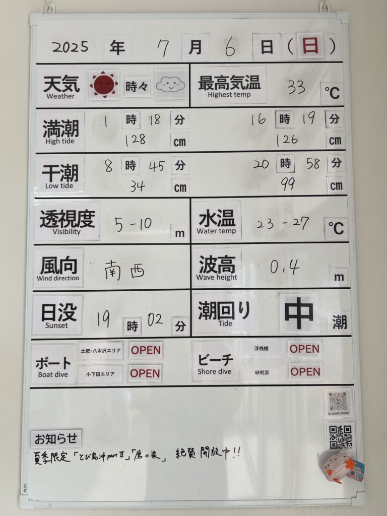 2025年7月6日 / 最終更新日 : 2025年7月6日 toids2021 海況情報 ビーチ&ボートともに【OPEN】です。 非常に穏やかなコンディションです。 ボートは小下田エリアまで快適に出船できます。 FacebookXCopy