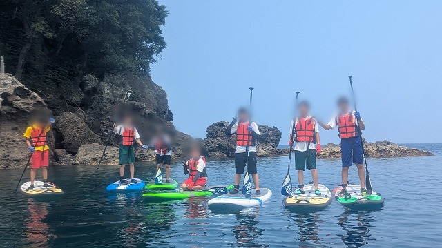 全校生徒がシュノーケリング、SUP、シーカヤックの班に分かれ、