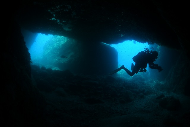 映画館のスクリーンのように四角く光る入り口にダイバーのシルエットを入れて撮るのがかっちょええねん。