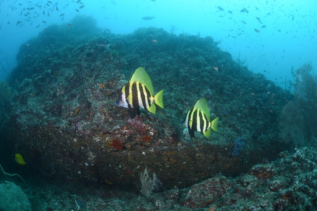 透視度は10~15mほどで、浅場は明るくキレイなのに対し、深場は浮遊物が多く白っぽく感じました。