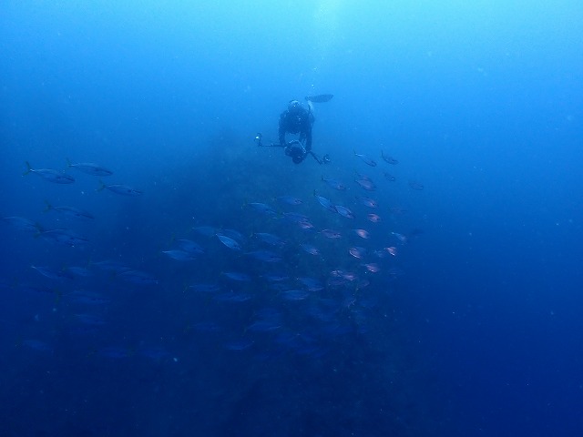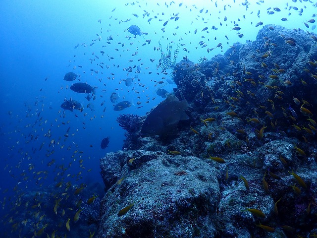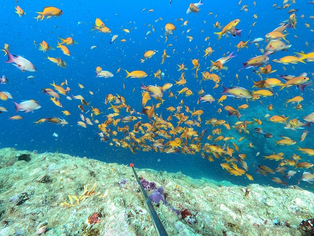 西の根は相変わらず濃厚なキンギョハナダイの群れに包まれていますが、1ヶ所穴が空いていました。
