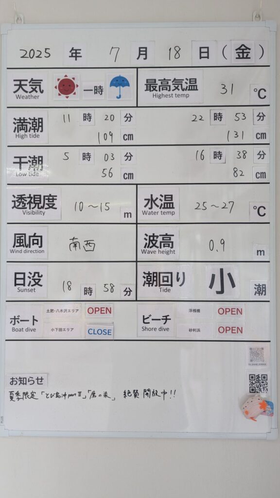 2025年7月18日 / 最終更新日 : 2025年7月18日 toids2021 海況情報 ビーチ&ボートともに【OPEN】です。 小下田エリアにはうねりが大きく残るため、ボートは八木沢エリアのみのOPENといたします。 ビーチは南西風耐性が高く影響ナシ、非常に穏やかで問題なく潜れます! FacebookXCopy