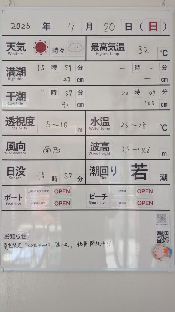 2025年7月20日 / 最終更新日 : 2025年7月20日 toids2021 海況情報 ビーチ&ボートともに【OPEN】です。 ほぼ風もなく、非常に穏やかな海況です。 小下田エリアへも快適に出船できます。 天気も良くダイビング日和です! FacebookXCopy