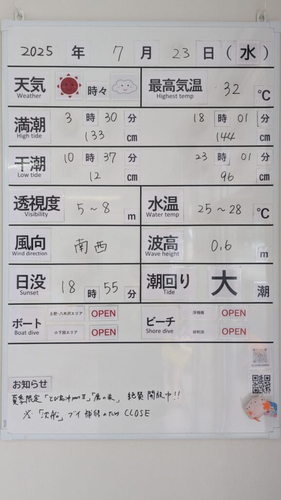 2025年7月23日 / 最終更新日 : 2025年7月23日 toids2021 海況情報 ビーチ&ボートともに【OPEN】です。 非常に穏やかな海況です。 小下田エリアへも問題なく出船できますが、昼頃から南西風が増してきますのでお早めに。 FacebookXCopy