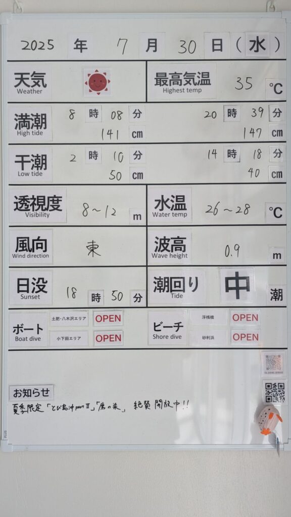 2025年7月30日 / 最終更新日 : 2025年7月30日 toids2021 海況情報 ビーチ&ボートともに【OPEN】です。 不思議とうねりが治まり、非常に穏やかな海況です。 透明度も回復傾向にあります。 ボートも問題なくOPEN! 小下田エリアへも出船可能です。 FacebookXCopy