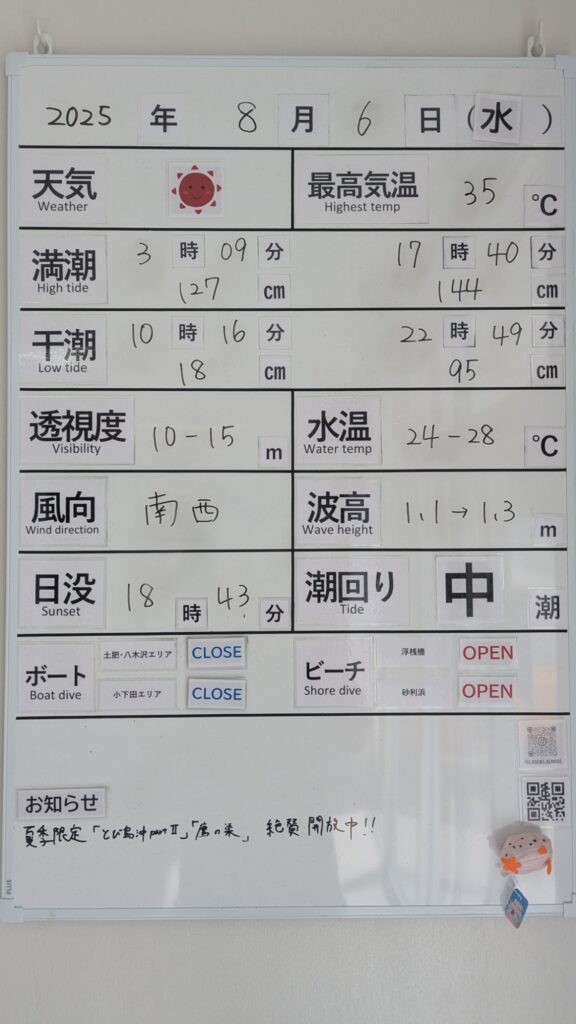 2025年8月6日 / 最終更新日 : 2025年8月6日 toids2021 海況情報 ビーチのみ【OPEN】、ボートは【CLOSE】です。 鉄壁の通り崎ビーチは全く問題なく潜れます。 南西風強く、沖の方はかなり荒れているためボートはCLOSEといたします。 FacebookXCopy