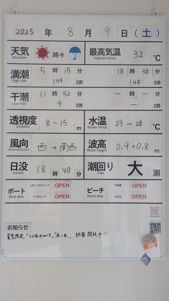 2025年8月9日 / 最終更新日 : 2025年8月9日 toids2021 海況情報 ビーチ&ボートともに【OPEN】です。 風が止み、やっと穏やかな海況になりました。 若干うねりが残りますが、小下田エリアへも出船可能です! FacebookXCopy