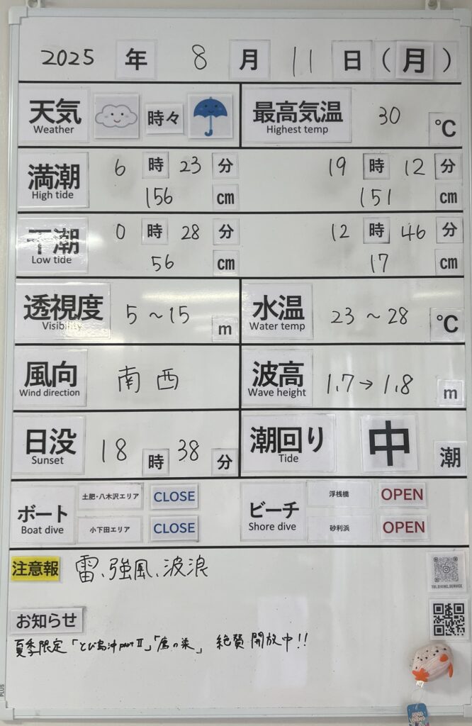 2025年8月11日 / 最終更新日 : 2025年8月11日 toids2021 海況情報 ビーチのみ【OPEN】、ボートは【CLOSE】です。 引き続き強い南西風のためボートはオールCLOSEです。 ビーチは問題なく潜れます! 終日雨の予報ですので足元にご注意ください。 FacebookXCopy
