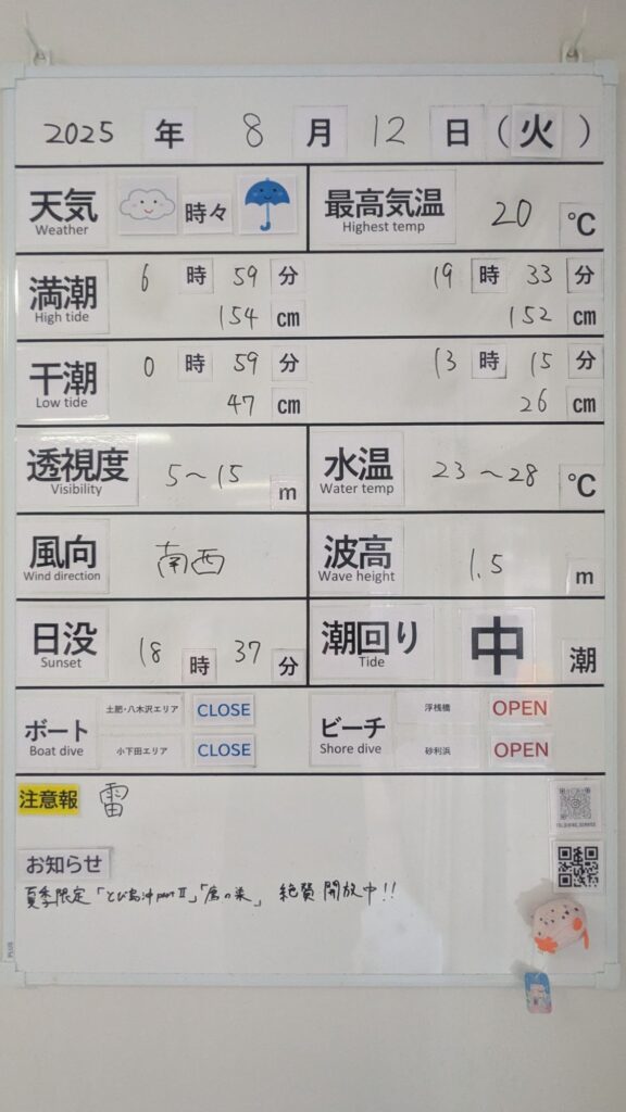 2025年8月12日 / 最終更新日 : 2025年8月12日 toids2021 海況情報 ビーチのみ【OPEN】、ボートは【CLOSE】です。 ビーチは揺れも少なく、問題なく潜れます。 浅場の透視度は若干落ちていますが、下の方は濁りもなく澄んでいます! FacebookXCopy