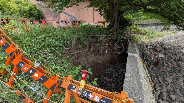 通り崎ビーチの砂利浜へと続く道の堤防が破損しており、大きな木の根元から徐々に浸食されてしまっています。