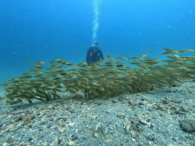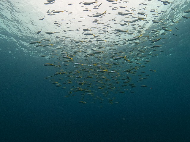 群れの中に数匹の小柄なワカシやカンパチのような回遊魚も混ざっていました。