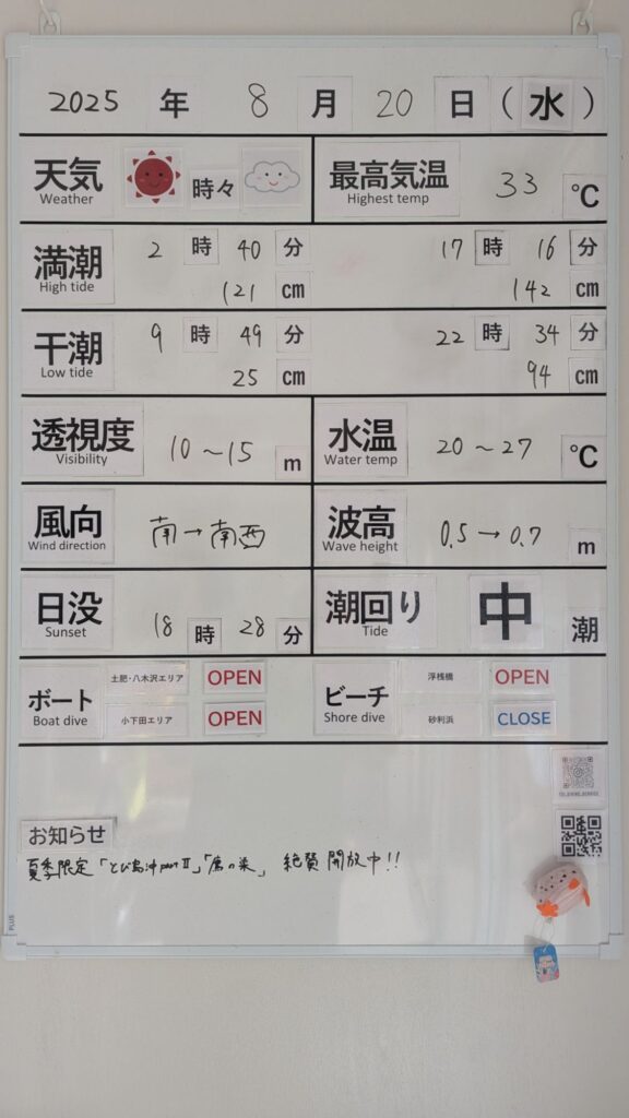 2025年8月20日 / 最終更新日 : 2025年8月20日 toids2021 海況情報 ビーチ&ボートともに【OPEN】です。 朝は風もなく、ベタ凪の非常に穏やかな海況です。 午後からは南西風が強まってきますので、小下田エリアは午前中のみのOPENなるかもしれません、お早めに。 FacebookXCopy